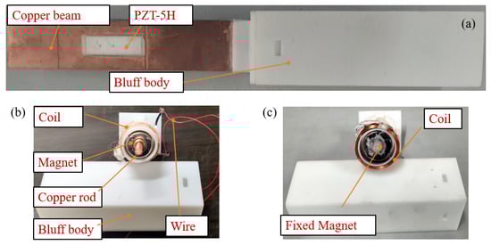 The GPEEH is made up of a galloping piezoelectric energy harvester (GPEH) and an electromagnetic energy harvester (EEH) which is shown in Figure 1. It mainly contains a copper cantilever beam, a PZT-5H, and a hollow bluff body. The piezoelectric sheet is bonded at the fixed end of the beam and the bluff body is installed on another free end of the beam. When the stable wind flows through the bluff body, the negative aerodynamic damping due to flow separation and vortex shedding will cause the wind-induced galloping instability of the cantilever beam, resulting in ultimate cycle oscillation.