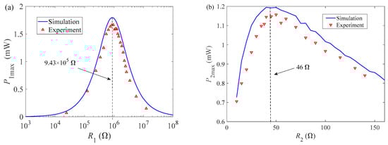 Output power curve with the load resistances. (a) Comparison between R1 optimal load experimental value and numerical analysis value (b) R2 optimal load experimental value and numerical analysis value comparison.