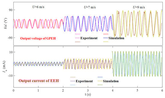 Comparison of time-domain diagram of experimental results and numerical analysis results of the output performance of GPEEH at 6, 7, 9 m/s.
