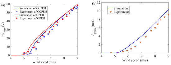 GPEEH and CGPEH output parameters of experimental and simulated change with wind speed (a) Volmax (b) Icmax (c) Prms.