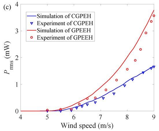 Figure 15c shows the comparison diagram of GPEEH and CGPEH effective output power between experiment and simulation. During the experiment, the GPEEH output voltage and current waveforms are usually unstable, but in order to simplify the research process, we also use Equation (32) during calculating the effective power of the experimental part. The values and trends of experiments and simulations of GPEEH and CGPEH in Figure 15c are the same. At 9 m/s, the effective output power of the GPEEH experiment reached 3.57 mW. The effective output power of the CGPEH experiment reached 1.68 mW. The experimental improvement efficiency was 112.5%, which was 8.5 % worse than that of the simulation result. In summary, the simulation and experiment are consistent and the deviation is within the acceptable range, so the correctness of the model is verified.