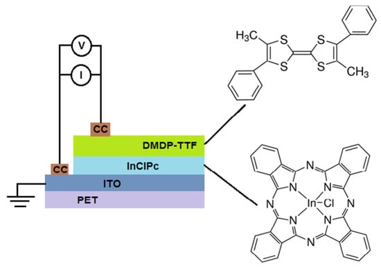 Schematic illustration of polyethylene terephthalate (PET)/indium tin oxide (ITO)/indium phthalocyanine chloride (InClPc)/4,4′-Dimethyl-5,5′-diphenyltetrathiafulvalene (DMDP-TTF)/conductive carbon (CC) device.