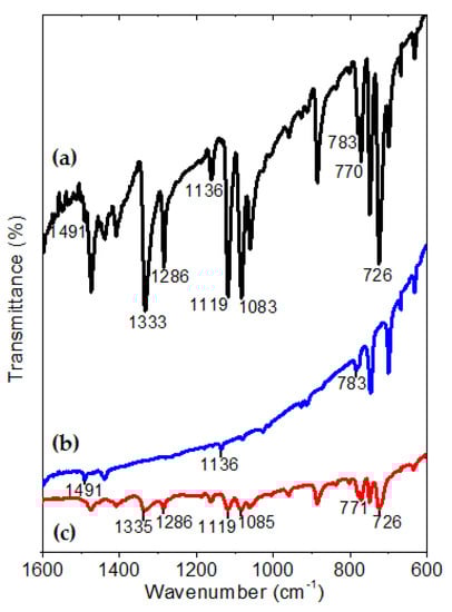 After the deposit, FTIR spectroscopy was carried out to identify the principal chemical bonds and functional groups in the InClPc and DMDP-TTF films. The deposition of thin films by the HVTE method resulted in phase changes in the organic semiconductors. These physical changes in the material can induce degradation of the molecular skeleton of InClPc and DMDP-TTF. FTIR spectroscopy helps to determine whether or not the materials underwent a chemical decomposition. The FTIR spectrum of the InClPc/DMDP-TTF films was compared with the spectra of the InClPc and DMDP-TTF compounds, and Figure 2 shows the most important signals. The InClPc spectrum is characterized by out-of-plane C-H mode (726 cm−1), in-plane C-H bending modes (1085, 1119, and 1286 cm−1) and in-plane C-N mode (1332 cm−1) [37,54,55,56]. On the other hand, the DMDP-TTF spectrum is characterized by in-plane C-S mode (1491 cm−1), in-plane C-H mode (1136 cm−1) and out-of-plane C=C mode (783 cm−1) [57]. According to the spectrum in Figure 2a, the deposited InClPc/DMDP-TTF films were formed by the same functional groups as those belonging to the DMDP-TTF and InClPc. Small variations in the signals of 1083 and 1333 cm−1 for in-plane C-H and C-N modes, respectively, and referring to phthalocyanine, were generated by the concentration of stress during the deposition of the films. However, these results indicated that the HVTE method did not chemically degrade the InClPc or the DMDP-TTF, and can be used for the preparation of films. On the other hand, phthalocyanines such as InClPc present in thin films a certain crystalline form, or become amorphous depending on the film fabrication procedure [37]. Information about the structure and molecular orientation can be extracted by comparing the intensity of the vibrational modes of InClPc KBr pellet and film spectra [37]. The FTIR spectrum of the InClPc/DMDP-TTF films is dominated by the strong intensities of the in-plane mode signals of the phthalocyanine. These signals, where the in-plane modes in the FTIR spectrum are clearly enhanced, correlate with a preferential orientation of the InClPc molecules on the surface of the film. Additionally, the FTIR spectrum is used to identify the phase nature of InClPc, as the spectrum is markedly dependent on the chemical composition and its crystalline form [56]. MPcs are known to have different polyforms, which can be identified by FTIR spectroscopy [58,59]. Two polymorphs (α-metastable and β-stable) can occur because of the slight differences in the π–π electronic interaction between molecules in close proximity within the lattice [56]. The β-form gives rise to vibrations at about 770 cm−1, while the α-form produces vibrations at about 720 cm−1 [58,60]. Figure 2 shows the infrared absorption spectra, where the two crystalline forms are shown with the values of 723 and 768 cm−1, respectively, for α- and β-form. The presence of both crystalline forms may affect the charge transport and conduction properties of the device, due to the electronic interaction within the InClPc and at the InClPc/DMDP-TTF junction.