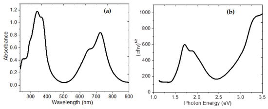 The active layer was fabricated by the sequential deposition of InClPc and DMDP-TTF films. UV-vis spectroscopy is widely used to characterize the electronic properties of the InClPc/DMDP-TTF active layer through the determination of parameters describing the electronic transitions, such as band gap [61]. The UV-vis spectra of the InClPc/DMDP-TTF active layer deposited on quartz are shown in Figure 3a. The region between 250 and 400 nm in the spectrum shows superimposed bands of InClPc and DMDP-TTF species [62,63]: (i) the absorption around 255 nm is assigned to the DMDP-TTF film and (ii) the InClPc film shows a Soret electronic absorption band with two peaks at 340 and 380 nm [37,54,55,56,57,58,59,60,64,65]. The Soret band indicates the presence of a d-band associated with the central metal atom in InClPc [65,66]. In addition to the Soret band in the near ultraviolet region, the InClPc has a band in the visible region called the Q band [37,54,55,56,57,58,59,60,64,65]. The Q band has two peaks at wavelengths of 650 and 724 nm, and the high energy peak of the Q band has been assigned to the first π→π* transition on the phthalocyanine macrocycle. The low energy peak of the Q band has been explained variously, as a second π→π* transition, as an exciton peak, as a vibrational internal interval and as a surface state [60]. The characteristic splitting in the Q band is typically observed in the α-form in the InClPc films [37]. The UV-vis characterization suggests that the HVTE method for phthalocyanine powders leads to the formation of films where the α-form is predominant.