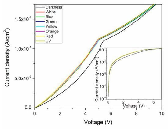 For electrical characterization, J-V measurements were conducted under darkness and illuminated conditions. On Figure 4, we can see a diode-type characteristic with a two-step shape for all curves. The darkness condition characteristic has lower current density values than those of the illuminated conditions, therefore indicating a photovoltaic response under different light wavelengths. The observed photovoltaic response is more pronounced for voltages lower than 6 V. For the darkness condition, a 5.0 × 10−2 A/cm2 current density value can be observed at 3.50 V, whereas for the illuminated condition a 7.50 × 10−2 A/cm2 current density value can be observed at 3.50 V. Nevertheless, this variation is diminished for voltage values close to 9 V, where it tends to 1.70 × 10−1 A/cm2. The latter observations can be corroborated on the Figure 4 inset, where the semilogarithmic J-V curve is shown. The increase in current is due to an increase in the photogenerated carrier’s concentration, a consequence of the active layer’s interaction with the incident light where absorption take place, resulting from the incident photon energy being larger than the band gap, which allows the electronic interaction of the donor–acceptor system, which is subsequently followed by the exciton’s dissociation at the interface [68]. Additionally, there is a slight variation in the curve depending on the incident light wavelength, observed on Figure 4. It is important to point out that the molecular extinction coefficient of the InClPc varies with wavelength [35], resulting in a change in photon absorption, which may contribute to the charge transport, and then current generation, which impacts the device’s external quantum efficiency (EQE) [68]. The previous, combined with the exciton diffusion length and absorption depth, which may favor certain light wavelengths, support the observed current density variation with the incident light.