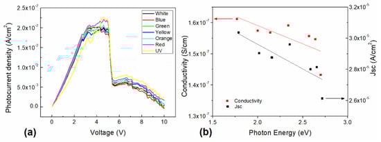 (a) Photocurrent density vs. voltage characteristic for various illuminated conditions. (b) Device conductivity and Jsc as a function of the photon energy.