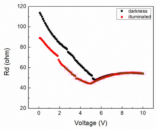 The diode resistance (Rd) is plotted as a function of the applied voltage on Figure 6, for darkness and illuminated conditions. The diode resistance is lower for the illuminated condition than for the darkness condition due to an increase in the charge carrier density, a result of the photogenerated exciton dissociation at the InClPc/DMDP-TTF junction. Additionally, the Rd is inversely proportional to the device current, which is increased under the illumination condition, ands this results in a diminution of the Rd. We can observe two different behaviors; the first one is a decrease in the device’s resistance with the applied voltage, from 115 Ω to 55 Ω, and the second is the constant device resistance (~55 Ω) with applied voltage for voltages higher than 5.5 V. The lowest device resistance was observed at 5.50 V with 50 Ω. It can be observed that the device resistance is reduced under illumination, and the decrease occurs at 0 V from 115 Ω to 90 Ω, which is an almost 22% reduction. However, for the illuminated condition, the reduction in the device’s resistance with applied voltage is from 90 Ω to 45 Ω. This is followed by a curve behavior of similar values to the darkness condition.