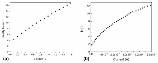 The calculated ideality factor derived from Equation (4) is 0.97, which approximates and is in accordance with the ideal diode. However, the voltage-dependent ideality factor (n) of the device is shown in Figure 7a for voltages ranging between 0 and 1.6 V. The n values are found to be relatively higher than the ideal diode (n = 1) for voltages higher than 0.1 V. The values are found to be between 4 and 17, indicating that the diode presents a nonideal behavior as a possible consequence of the lack of film homogeneity and the interfaces. Additionally, the observed changes in the ideality factor may indicate that the device suffers from high electron hole recombination in the depletion region. A slight change in the slope is observed, which may be related to the effect of the device resistance, dominated by shunt and series resistance for lower and higher voltages, respectively. Therefore, the observed effect on the device’s resistance may be caused by an increase in the series resistance to a saturation value, which causes the current density through the device to present an almost direct relation with the applied voltage.