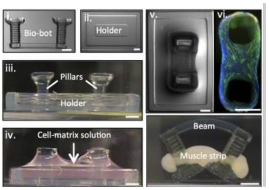 - Cvetkovic, C.; Raman, R.; Chan, V.; Williams, B.J.; Tolish, M.; Bajaj, P.; Sakar, M.S.; Asada, H.H.; Saif, M.T.A.; Bashir, R. Three-dimensionally printed biological machines powered by skeletal muscle. Proc. Natl. Acad. Sci. USA 2014, 111, 10125–10130. [Google Scholar] [CrossRef]