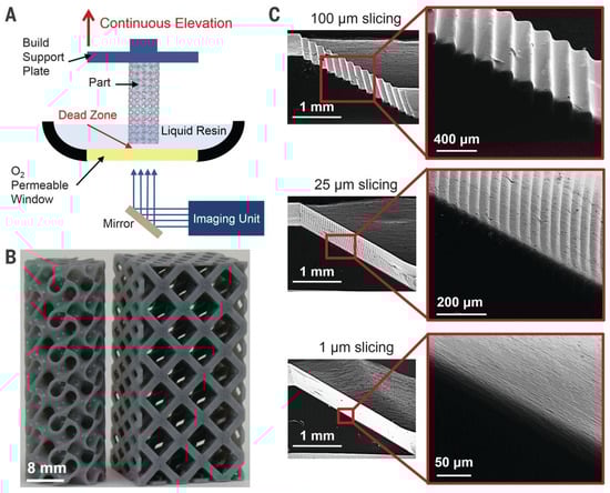 - Tumbleston, J.R.; Shirvanyants, D.; Ermoshkin, N.; Janusziewicz, R.; Johnson, A.R.; Kelly, D.; Chen, K.; Pinschmidt, R.; Rolland, J.P.; Ermoshkin, A.; et al. Continuous liquid interface production of 3D objects. Science 2015, 347, 1349–1352. [Google Scholar] [CrossRef] [PubMed]