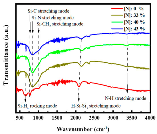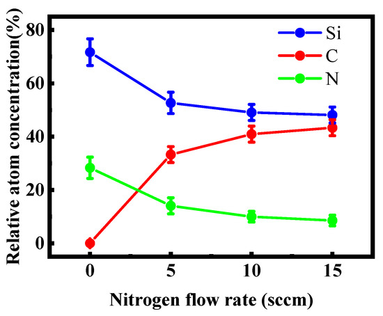 The FTIR spectrometer was employed to clarify the bonding configurations of the films incorporated with different N contents, and the results are shown in Figure 3. The absorption peak at ~640 cm−1 corresponded to the SiHn rocking vibration [27]. The absorption peak at ~780 cm−1 corresponded to the Si–C stretching vibration [23]. The ~850 cm−1 absorption peak was ascribed to the Si–N stretching vibration [28]. The absorption band at ~1000 cm−1 was associated with the Si–CH2 stretching vibration, and the 1250 cm−1 absorption peak was ascribed to the C–Hn stretching vibration [27]. The peak at ∼2140 cm−1 bands was connected to the Si–H stretching mode [27]. The 3350 cm−1 peak corresponded to the N–H stretching mode [28]. As shown in Figure 3, the SiHn rocking vibration disappeared while the Si–C and Si–N stretching vibrations strengthened as the N content increased in the films. Therefore, the films mainly existed in the form of Si–C and Si–N bond structures.