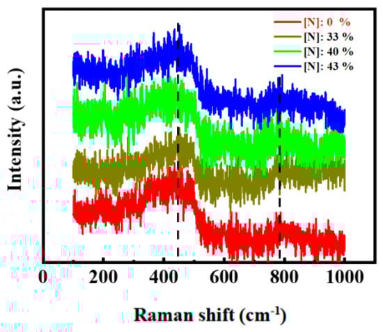 Figure 2 presents the Raman scattering spectra of the films with different N contents. A dominant Raman peak appeared at around 480 cm−1, which was attributed to the transverse optical vibration mode of the amorphous silicon [26]. A weak peak at ~790 cm−1 corresponded to the longitudinal optical vibration mode of SiC [26]. The results indicated that Si–Si and Si–C bonds existed in the form of an amorphous structure and no other Si and/or SiC nanocrystalline structure was produced in the films.