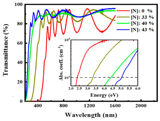Figure 4 shows the transmission spectra of the films with different N contents. With the increase in the N content from 0% to 43%, the absorption edge moved toward the short-wave direction, indicating that the increase in the N content effectively widened the optical bandgap of the films. According to the formula [29]: