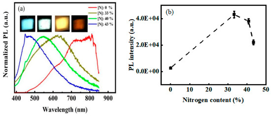 (a) Normalized PL spectra and (b) corresponding photoluminescence intensity of the films incorporated with different N content under an excitation wavelength of 325 nm.