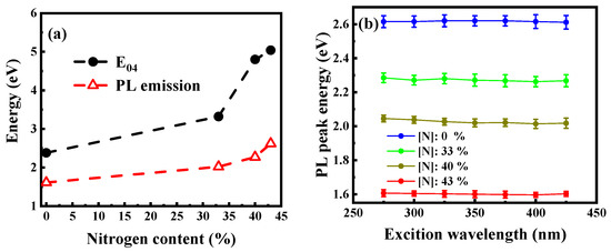 Figure 5a displays the normalized PL spectra of the films incorporated with different N contents. For the films without N, the PL spectra, excited by the 325 nm line from the Xe lamp, peaked at around 800 nm. With the increase in N content from 0% to 43%, the PL peak blueshifted and gradually moved from ~800 nm to ~450 nm. All the films exhibited a strong visible light emission under 325 nm excitation that could be clearly observed by the naked eye in a bright room environment (Figure 5a). Moreover, the PL intensity increased rapidly with the increase in N content and reached the maximum when the N content was 33%. Compared with the films without N, the samples incorporated with N showed a 22-fold increase in PL intensity (Figure 5b). These results implied that N plays an important role in the PL of a-SiCx. That is, N can modulate the PL wavelength of a-SiCx and greatly increase PL intensity. Comparing Figure 4 and Figure 5b showed that the change of the optical bandgap with N content was optically consistent with the change of the PL peak energy with N content (Figure 6a). In addition, the energy of the optical bandgap was significantly greater than the corresponding PL peak energy. This result suggested that PL did not originate in band-to-band recombination. The PL spectra of the films excited at different excitation wavelengths were also studied herein to gain further insights into the PL characteristics. As shown in Figure 6b, the PL peak position barely changed with the excitation wavelength increasing from 275 nm to 425 nm. This behavior was consistent with that of defect-related PL, in which the peak position was independent of the excitation wavelength because of the narrow distribution of the defect-related localized state [30]. Thus, PL was considered to originate from defect-related luminescence centers.
