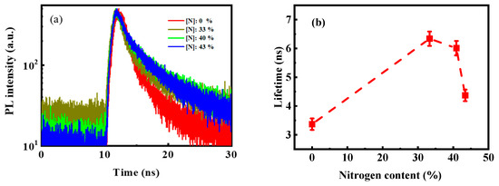 where I0 is the background constant, τ1 and τ2 are the luminescence lifetimes of the two decay processes, and A1 and A2 are the proportions of the two decay processes. According to the fitting equation, the average luminescence lifetime was calculated to be in the nanosecond range, as shown in Figure 7b. This result was consistent with the defect luminescence lifetime of Si-based materials reported in the literature [16,31]. This result further supported the speculation that PL arose from defect-related luminescence centers. By comparing Figure 5b and Figure 7b, we found that the change of the luminescence lifetime with the N content was consistent with that of the PL intensity. As shown in Figure 7b, the luminescence lifetime increased from 3.4 ns to 6.3 ns with the increase in N content from 0% to 33%. In luminescent silicon-based materials, radiative channels and nonradiative channels are involved in the recombination process of carriers. The lifetime of the nonradiative recombinations for the luminescent silicon-based materials is much shorter than that of radiative recombinations [32], and thus the increase in the measurement luminescence lifetime is mainly due to the decrease in nonradiative channels in the recombination process of carriers. Therefore, the increase in the luminescence lifetime indicated that the increase in the N content effectively passivated the nonradiative recombination centers to some extent. The Si–N bonding energy is known to be greater than the Si–Si bonding energy. Therefore, with the addition of N during the growth process, the Si–Si bond was partially replaced by the Si–N bond. The weak Si–Si bond was particularly reduced, thereby reducing the nonradiative recombination centers. The increase in the PL intensity with the N content (Figure 5) proved this view. When the N content increased from 40% to 43%, the PL intensity gradually decreased, and the luminescence lifetime decreased from 6.2 ns to 4.2 ns. This result could be attributed to the continued increase in N that aggravated the disorder of the films and, thus, led to the increase in the nonradiative recombination centers in the films. Properly modulating the N content in Si-rich SiCx could effectively widen the optical bandgap, and an efficient light emission could be obtained.