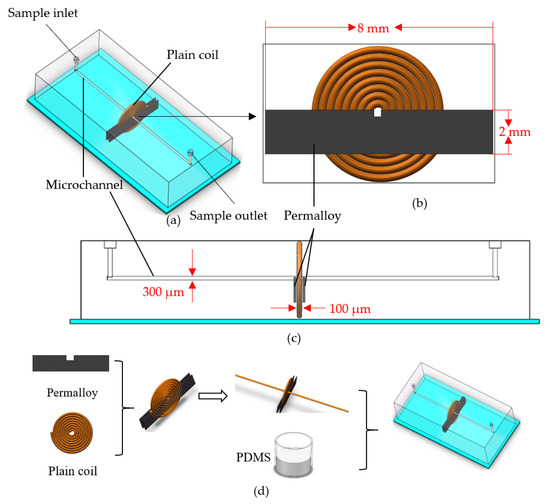 The manufacturing process of the permalloy is as follows (Figure 1d). The permalloy material was first prepared using a precision grinding wheel cutting machine (TWC50-A, Shen Zhen He Dong Technology Co., Ltd., Shen Zhen, China) to cut out different sizes of permalloy. It was then placed in a hydrogen furnace (QSXF-2-12, Hang Zhou Lan Tu Precision Instruments Co., Ltd., Hang Zhou, China) for annealing treatment. The heat-treated permalloy has a strong magnetic permeability. A precision winding machine (Shi Li SRDZ23-1B, Zhong Shan Shi Li Wire Winder Equipment, Zhong Shan, China) was used to wind the plane coil, and fix the wound coil on the correct position on the silicon plate. The permalloy was then fixed on both sides of the coil, a 7 cm long copper rod with a diameter of 300 μm was used as the mold for making the microchannel, and the mold was inserted into the permalloy slot and the inner hole of the plane coil. After mixing PDMS (polydimethylsiloxane) and curing agent 10:1, the model was casted with the mixture, and the copper rod for making the microchannel was drawn out, encapsulated, and the sample inlet and outlet were made.
