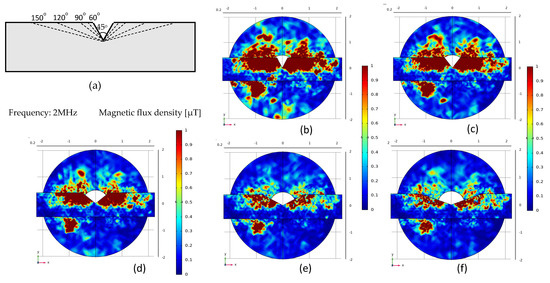 As shown in Figure 3a, triangular grooves with different angles are designed at the center of Permalloy, the groove depth is 1 mm, and the angles are 45°, 60°, 90°, 120°, and 150°. The corresponding simulation result picture is shown in Figure 3b–f. When the groove depth is constant, the smaller the opening angle, the greater the magnetic flux density. As shown in Figure 3b when the permalloy groove angle is at 45° the maximum magnetic flux density is 8.38 μT, and the maximum position is near the edge of the coil. As the angle increases, the magnetic flux density gradually decreases. When the angle is 150° as in Figure 3f, the maximum magnetic flux density is 1.34 μT, near the edge of the coil. The simulation result curves of different angles are shown in Figure 4a.