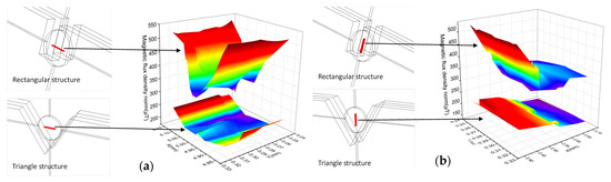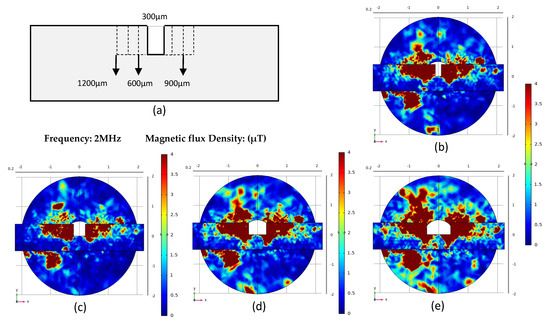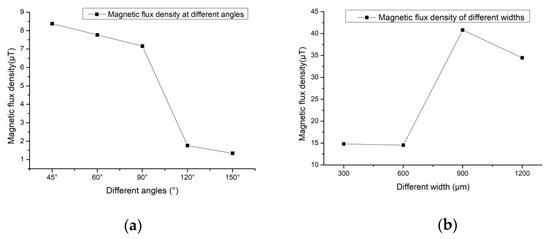Figure 5 shows the simulation results of the permalloy rectangular groove. The depth of the rectangular groove shown in Figure 5a is 1 mm, and the groove width is 300 μm, 600 μm, 900 μm and 1200 μm. The corresponding simulation result picture is shown in Figure 3b–e. Different from the simulation result of the triangular groove, the magnetic flux density of the permalloy of the rectangular groove structure is much greater than that of the permalloy of the triangular structure after being magnetized. When the width of the rectangle is 300 μm, the maximum magnetic flux density is 14.81 μT; When the width of the rectangle is 900 μm, the maximum magnetic flux density is 40.80 μT, which is also the largest magnetic flux density among all the results. The result curve is shown in Figure 4b.