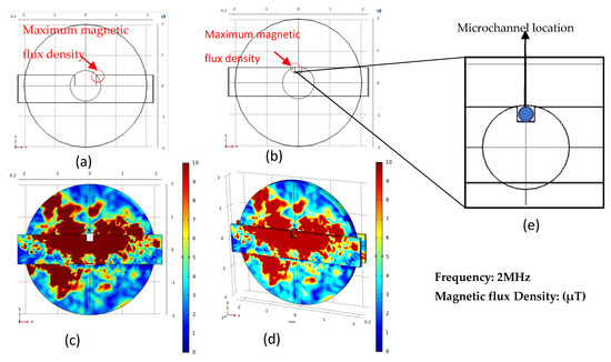 Permalloy structure with the highest magnetic flux density: (a) 1200μm wide rectangular slot, the maximum magnetic flux density is at the edge of the slot and inner hole of the coil; (b) A rectangular slot with a width of 300μm and a depth of 500μm, the maximum magnetic flux density is at the edge of the slot and inner hole of the coil; (c) Simulation results corresponding to the figure (b); (d) The result of two pieces of Permalloy in figure (b); (e) The Microchannel location in figure (b).