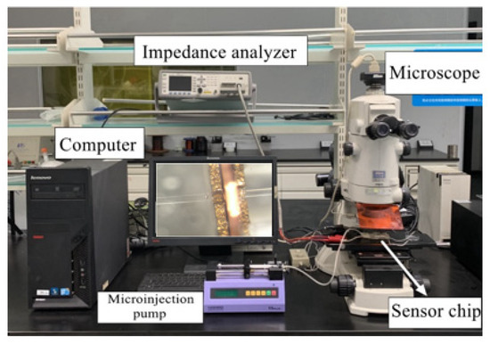 The experimental system consisted of an impedance analyzer (Keysight E4980A, Agilent Technologies Inc., Bayan Lepas, Malaysia), a microscope (Nikon AZ100, Nikon, Tokyo, Japan), a micro-injection pump (Harvard Apparatus B-85259, Harvard Apparatus, Holliston, MA, USA), a computer with a LabVIEW data acquisition unit and our high-gradient magnetic field sensor. The iron particles and copper particles used in the experiment were customized by professional laboratory equipment manufacturers (Beijing Huafeng Experimental Materials Co., Ltd., Beijing, China). The test bench system is shown in Figure 8.