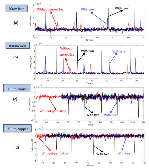 All experiments are the results of multiple measurements in dynamic mode. The experiment adopts the rectangular structure in Figure 6e. The comparison experiment was carried out using sensor with no permalloy, one piece of permalloy, and two pieces of permalloy. The iron particles of 70 μm and 100 μm, and the copper particles of 140 μm and 150 μm were randomly selected to compare the detection signals. The signal results are shown in Figure 9. The magnetization of iron particles is greater than that of eddy currents, so upward signals were generated, as shown in Figure 9a,b; the magnetization of copper particles is smaller than that of eddy currents, so downward signals were generated, such as Figure 9c,d.