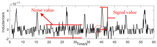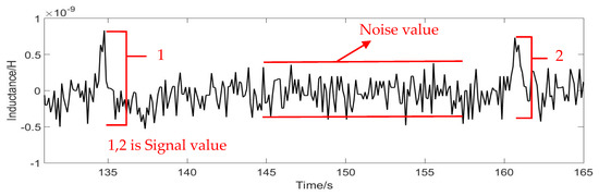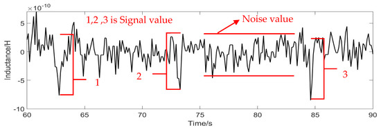 In Figure 9, the red curve is the signal diagram of particles without permalloy; the blue is the detection signal diagram of particles with only one piece of permalloy; the black curve is the detection signal diagram of particles with two pieces of permalloy. The result of the detection signal in the Figure 8 reflects that after adding permalloy at both ends of the coil, the value of the detection signal is significantly improved. For 140 μm copper particles, when there is no permalloy, the sensor cannot capture the detection signal of copper particles; when a piece of permalloy is added, it can detect the signal of 140 μm copper particles, and the average signal value at this time is −7.2045 × 10−10 H; when two pieces of permalloy are added, the average detection signal value is −2.1850 × 10−9 H.