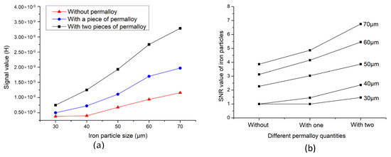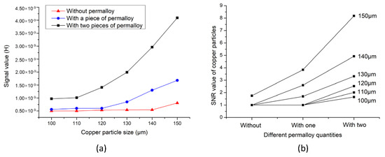 Figure 11a shows the average signal value of different iron particles, which confirms the previous conclusion. When permalloy is added to the sensor, the amplitude of the detection signal significantly increases, and the larger the particle size, the more obvious the signal increase. Figure 11b shows the SNR values of iron particles of different sizes. The SNR ratio reflects the accuracy of the sensor for particle detection. In Figure 11b, when the iron particle size is 30 μm and 40 μm, the SNR of the sensor without permalloy is 1, which indicates that the sensor cannot detect particles of this size. The sensor with a piece of permalloy has a SNR of 1 for detecting iron particles of 30 μm, and the sensor cannot detect particles of 30 μm. In contrast, the sensor with two pieces of permalloy has a SNR of 1.47 when detecting iron particles of 30 μm, which indicates that the sensor can detect iron particles below 30 μm. As the particle size increases, the SNR value increases, and the SNR of the sensor with two pieces of permalloy drastically increases as compared to others. Figure 12 shows the detection signal value and SNR of copper particles. The result of Figure 12a shows that the signal value of the sensor without permalloy is lower than that of the sensor with permalloy when detecting copper particles of different sizes. The lower detection limit of the sensor without permalloy is 150 μm, the sensor with one piece of permalloy can detect 130 μm, and the sensor with two pieces of permalloy can detect copper particles of 100μm, with an SNR of 1.65. This shows that the structure designed in this paper can detect copper particles below 100 μm, as shown in Figure 12b. The results of the increasing SNR of iron particles and copper particles of different sizes are shown in Table 1 below.