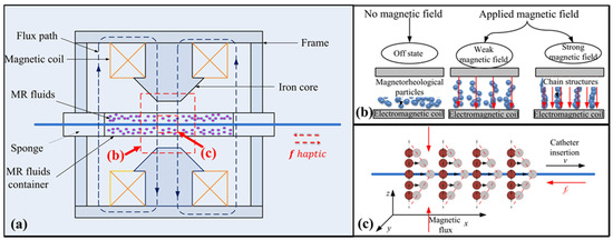 The stronger the magnetic field, the greater the strength of the solid-like state is. For this reason, it will generate a resistance force between the MR fluids and the catheter when a rigid rod is inserted into the MR fluids with a magnetic field (see Figure 2c). Based on this, the master haptic interface was developed (see Figure 2a). Since the resistance force can be adjusted by the magnetic field intensity, which is controlled by a current [30]. When a catheter in the slave side encounters the vascular tissue, a current triggered by a transducer signal is sent to the MR haptic device, which creates a slight resistance for the operator associated with the vascular tissue. It is like operating a catheter inside the blood vessel beside a patient in vascular interventional surgery.