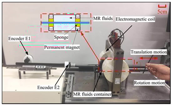 As shown in Figure 3, the prototype of the master haptic interface consists of two parts: the haptic interface and the motion transmission unit. The detailed specifications of the haptic interface had been designed by Yin et al. [21]. To prevent the overflow of MR fluids from the small holes of the container and reduce the friction caused by the edge of the holes, the dynamic seal method was proposed. The permanent magnets and sponges were adopted to prevent the overflow of MR fluids (see Figure 3). The magnitude of the permanent magnets is small enough to prevent the MR fluids from flowing out without affecting the friction between the MR fluids and the catheter [21]. The motion transmission unit uses a pinion and rack mechanism mounted on a linear slide. It is coupled to two rotary encoders (MTL, MES020–2000P, Japan), Encoder (E1) and encoder (E2) with 2000 counts/revolution, measures the relative axial displacement of the linear slide and the radial displacement of the rigid rod, respectively. The surgeon’s natural actions, translation, and rotation, during the procedures, are captured by the motion transmission unit. The surgeon uses a rod that passes through the haptic interface attached with the motion transmission unit to perform actions similar to a conventional endovascular procedure. The actions measured by rotary encoders are converted to command signals for the slave manipulator.