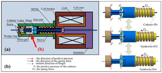Based on these requirements, an electromagnetic breaking-based adaptive clamping structure, shown schematically in Figure 4a, is proposed. When the coil is not energized, the collet will be pressed into the tapered hole of the wedge ring by the spring force (Fs), which can be adjusted by two screws. The collet will generate the positive forces (F) on the catheter/guidewire under the extrusion of the wedge ring and hinges. The resulting static friction forces make the catheter/guidewire and collet into a whole. In addition, the large clamping area and the use of silica gel ensure the stability of the catheter/guidewire clamping due to the increase in static friction force. Figure 4b demonstrates the adaptivity of the clamping structure. The clamping structure will not fail even if the diameter of the clamping object is small.