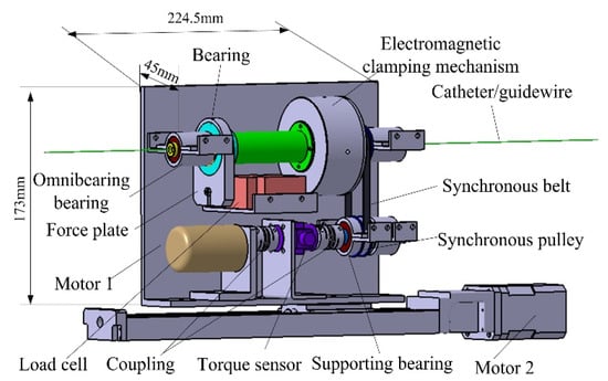 The slave manipulator, schematically shown in Figure 5. It consists of three parts: the electromagnetic clamping mechanism, force measurement mechanism, and motion driving mechanism [31]. The electromagnetic clamping mechanism has been introduced before (see Figure 4). The force measurement mechanism based on a load cell (resolution: 0.0002) is used to measure the force information between the catheter/guidewire and the blood vessel. The load cell is fixed on the support plate. A force plate fixed on the load cell is linked to the bearing installed on the clamping structure. The existence of the bearing ensures that the rotation action does not interfere with the force measurement. Two omnibearing bearings are used to minimize the influence of friction components on force measurement. A torque sensor placed between the torsional drive motor (motor 1) and the synchronous pulley is used to measure the torsional force. The motion driving mechanism composed of the ball screw and the synchronous belt with two motors achieves imitation of a surgeon’s insertion motion and twisting motion.