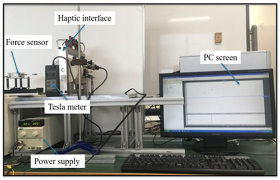 To evaluate the effectiveness of collision detection with haptic cues, the dynamic force assessment experiment is performed to achieve the magnitude of the haptic force. The experimental setup is shown in Figure 6. During the experimental process, a rigid rod connected with a load cell (TEAC, TU-UJ, Japan) is actuated by a sliding table to make the insertion motion in the haptic interface. The PC will record and display the generated force information of the haptic interface with and without magnetic fields. Since it is reported that the input velocity does not affect haptic forces, the input velocity is set to 5 mm/s [21]. To maximize the detection effect, the maximum current provided by the power supply is used to obtain the maximum magnetic field intensity, thus achieving the maximum haptic force. The state of MR fluids will be changed from a fluid-like to a solid-like within milliseconds [29].