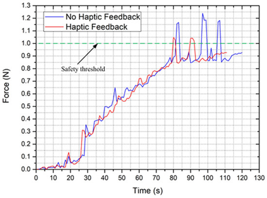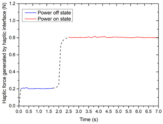 The experimental results are summarized in Figure 7. From the results, we can see that the dynamic force will quickly change from the initial value to the maximum value when the electromagnetic field is applied. Furthermore, the change of haptic force reaches about 600 mN, which is far greater than 19 mN (human’s finger detection resolution, i.e., just-noticeable difference (JND)) [32]. Therefore, this haptic change can quickly trigger the operator’s stress response and achieve the purpose of collision detection, even for novices.