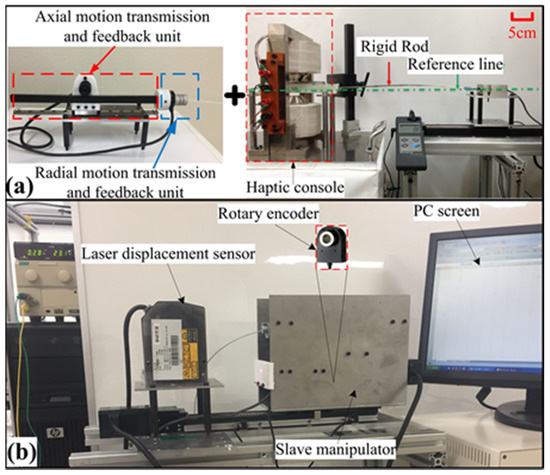 Experimental setup of collision detection performance for the presented system. (a) The master side of the presented system. (b) The slave side of the presented system.