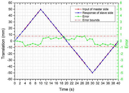 The bilateral operation experiment for the axial motion was performed. The error in translation, as shown in Figure 9, is bounded between ±0.79 mm. It depicts that the slave robot could precisely follow the trajectory of the master motion input unit that can meet the requirement of the surgery [35]. To verify the stability of the axial motion, the bilateral operation experiment was performed 10 times in the same conditions. The mean absolute error for each trial was summarized in Figure 10.
