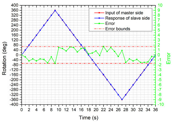 The bilateral operation experiment to evaluate the radial motion was conducted. The performance of radial motion transmission and the error is shown in Figure 11. The results show that the rotation error is bounded between ±1.7 degrees. After 10 times tests, the mean absolute error for each time was summarized in Figure 12. From the results, the standard deviations relative to their mean values have a significant discreteness. However, it can be acceptable because the absolute error within 2 degrees in this system could not affect the direction adjustment of the catheter/guidewire tip.