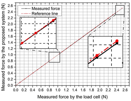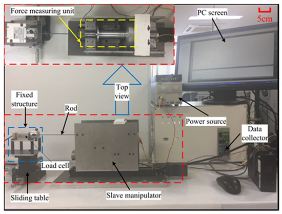 The accuracy is the primary concern for force measurement that requires an accurate force-measuring unit with a fast response. It has an important influence on the safety of surgeries, especially for fragile vessels. To validate the accuracy of the measured force, the step response experiment was performed. As shown in Figure 13, a rod with the silica gel film on the surface was clamped by the slave manipulator, and the other side was firmly connected to the load cell. After limiting the movement of the slave manipulator, the micro-feed of the sliding table increased the force exerted on the rod. The force was increased from 0 N to 2.5 N with a 0.1 N step increase in axial displacement. The force information was collected, respectively, by their own data collectors and displayed on the PC screen. The experiment was performed 10 times for each load, and their mean values are depicted in Figure 14.