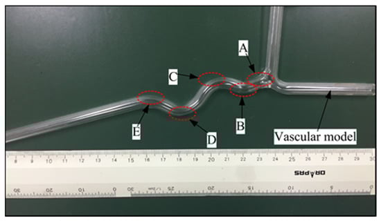 For investigating the dynamic characteristic of the force-measuring unit, the proposed slave manipulator is used to track a vascular model shown in Figure 15. In this vascular model, five curved areas are used to compare measurements because the tortuosity of vessels is one of the main failure reasons in endovascular procedures [13]. The experimental setup is displayed in Figure 13. A catheter-5Fr clamped by the slave manipulator was controlled to perform the insertion and retraction motion in the vascular model at 3.5 mm/s. When the catheter-5 Fr comes into contact with the vascular model, the force generated from the slave side is transmitted to the data acquisition unit. Next, the catheter-5Fr is directly connected with the load cell to perform the same insertion and retraction motion. The experimental process is as follows: the catheter passes through the A, B, C, D, E point of the vascular model in sequence under the action of the slave platform. When the tip of the catheter reaches the E point, the catheter retracts until it completely exits the vascular model. The results of force tracking were displayed in Figure 16. From the results, we can see that, when the catheter tip passed through the curved regions (areas with risk of perforation), the force measured from the slave side in the insertion process was slightly smaller than the actual force with a maximum error of 48.58 mN, which was acceptable in the actual surgery [36]. The maximum errors were found in the two regions (C and D) with the greatest degree of curvature. Perhaps the reason for this case is due to small loads absorbed by the spring and the difference in catheter deformation, which can cause different friction forces of the catheter. However, even with the technical difficulty, the usability of force feedback increased by having the force information available.