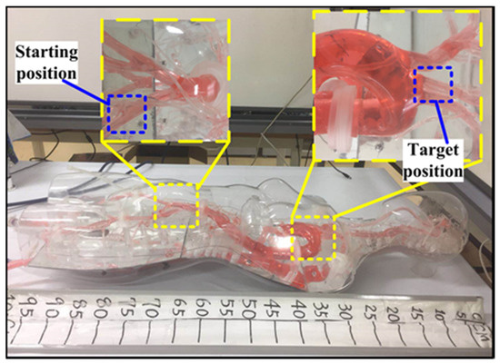 A simple insertion experiment was carried out to test the collision detection capability of the proposed system. The experimental object is the human body model called Endo Vascular Evaluator (EVE: FAIN-Biomedical, Nagoya, Japan), as shown in Figure 17. The starting position and the target position pressure are set to 120/80 mmHg. The actual task that the user(non-medical) has to complete is that the catheter is operated from starting position to the target position without damaging the blood vessels. The experimental conditions were considered as two modes. Each mode contained visual feedback by an Internet protocol (IP) camera and traditional force feedback. Mode1: haptic feedback (HF) means collision detection with haptic cues; Mode2: no haptic feedback (NHF) means just intuitive force feedback.