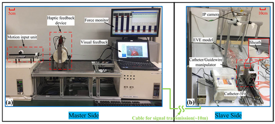 The experimental setup is shown in Figure 18. The master side was operated inside the control room. The force and visual monitor were placed at the master side (see Figure 18a). The slave side was placed nearby the EVE model inside the operation room (see Figure 18b). According to previous studies [30,37] and practical tests, the maximum measuring force of the catheter from the starting position to the target position for the EVE model is about 1 N without severe tip collision. Thus, the safety threshold is set to 1 N. The safety threshold of real human blood vessels should be comprehensively judged by experienced surgeons according to the actual blood vessel status and blood viscosity of each patient. Because the individual constitution is not the same, the elasticity of blood vessels is not the same. Blood vessels with age, disease, and other reasons will become weak elasticity, vascular sclerosis. For mode 1, when the measured force exceeds the safety threshold value, the shear force will be generated on the catheter in the haptic interface to increase resistance sensation, thus realizing collision detection obviously.