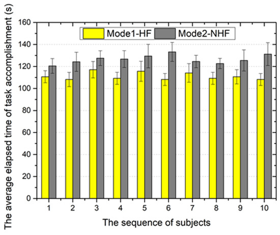 Figure 21 shows the average elapsed time of task accomplishment for all participating subjects. The statistical results indicate that the average elapsed time of mode 1 is shorter than that of mode 2. The primary reason for this reduction has been analyzed above. The reduction in operating time can reduce the time of radiation exposure for the patient, thereby reducing the radiation damage to the human body.