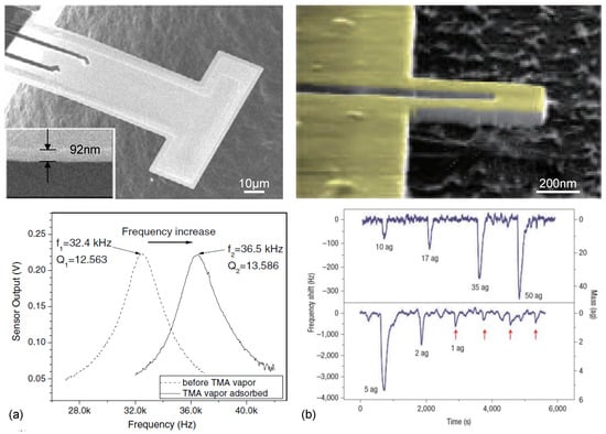 - Ono, T.; Li, X.; Miyashita, H.; Esashi, M. Mass sensing of adsorbed molecules in sub-picogram sample with ultrathin silicon resonator. Rev. Sci. Instrum. 2003, 74, 1240–1243. [Google Scholar] [CrossRef]