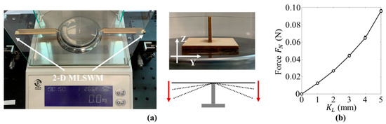 In the test, the displacement constraint is used to apply pre-constraint on the beam. Therefore, the influence of the value on the axial restrain force was studied first. We set up the simple experiment platform to measure the force , as shown in Figure 4a. In the test, the anchor wire ends are assembled in the 2-D MLSWMs (they can move along the Y and Z directions), respectively. When we moved the platforms and changed the height of the wire from 0 mm to −3 mm at intervals of 0.5 mm (six conditions) and then changed the height back to 0 mm at the same intervals, the relationship between force and was obtained by using the electronic balance, as shown in Figure 4b. As , increased, the force increased linearly, which supports our method of using the to describe the pre-constraint of the beam.