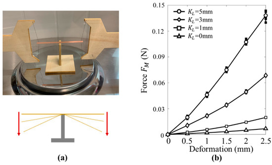 As shown in the Figure 5a, the same measurement method applied in the Section 3.1 was used to study the stiffness of the beam. Additionally, the relationship between the quasi-steady restoring force and the deformation is obtained in Figure 5b. We can see that, as the beam deformation increased, the force increased linearly. In addition, the stiffness of the beam increased with the increase of the constraint coefficient , which agrees well with the theoretical analysis of the beam in the Materials and Methods section. The larger means that the beam is under a larger axial restrain force , and then the lateral deformation stiffness will be enhanced.