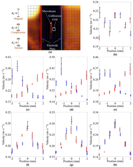 In the test, the value of is set from −5 mm to 5 mm at intervals of 2 mm, and the is also set as the standard condition (the whole test includes seven conditions). The positions −2 mm, 0 mm, and 2 mm are selected as three key observation positions. As shown in Figure 6a, after capturing the motion of the beam with a certain frame frequency f, the velocities of the beam passing through one calibration grid can be obtained. The oscillating velocity of the microbeam in one cycle is shown in Figure 6b–h. Besides, by recording the oscillating velocity of the beam in one cycle and taking the maximum velocity as the denominator, the velocity ratio (relative velocity) at different positions can be obtained as shown in Table 1.