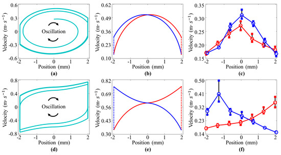 Simulation results of velocity-position curves: (a–c) experimental and numerical data for the pre-tension constraint; (d–f) experimental and numerical data for the pre-compression constraint. Velocity-position curves obtained by Equation (6) are shown in (a,d). Velocity-position curve in one cycle is depicted in (b,e). The experimental results in one oscillation cycle are pictured in (c,f). Where the red lines represent the data in the first half cycle, the blue lines represent the data in the second half cycle, (, and powering voltage VDC = 2.5 KV).