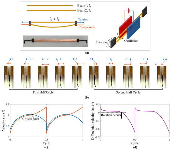 Figure 8b shows the photos of the motion for the double-beam resonator. We can see that the motions of the two beams are not synchronous; the differential motion of the two beams can be used to achieve the adjustment of the angle of attack during the oscillation. For example, at the beginning of Figure 8b, Beam 1 (blue points) moves faster than Beam 2 (red points); then, a positive angle of attack is created. Then, the double-beam structure keeps moving with a positive attack angle until Beam 2 moves faster than Beam 1. When the differential velocity of two beams achieves critical value, as shown in Figure 8c,d, the attack angle rotates from positive to negative. In a complete oscillation of the resonator, the attack angle is controlled by the differential motion of two beams to achieve an advanced rotation [2,21] with a very simple structure, which is attractive for the application of flapping-wing robotics.