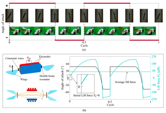 From the analysis of the above sections, the differential motion of the double-beam resonator can achieve advanced rotation during its oscillation. In the article by Dickinson [2,3], an advance in rotation relative to translation will have a great influence on the lift force of flapping wings. Therefore, we added two wings on both sides of the double-beams structure and captured the wing motion using the high-speed camera, which is the same as the flapping process of bee wings in nature, shown in Figure 9a. After capturing the wing motions, we also calculated the lift force by using the theoretical model in reference [19]. The results are shown in Figure 9b. At the beginning of the motion cycle, the initial lift force generated by the wing is greater than 0, which is consistent with the advanced rotation characteristics in the literature [2,3].