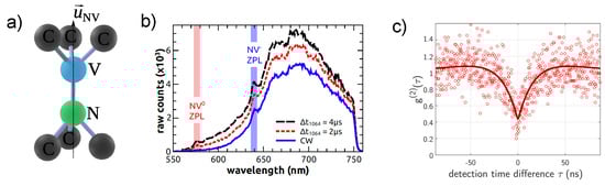 The NV color center is a point defect inside the diamond matrix consisting of a substitutional nitrogen atom (N) combined with a vacancy (V) in one of the nearest neighboring sites of the diamond crystal lattice as depicted in Figure 2a. This defect behaves as an artificial atom hosted by the diamond matrix. It combines unique luminescence and spin properties. Indeed, because its energy levels are well within the large band gap of diamond, the NV center has an extremely stable luminescence in the near-infrared. It can be found in two different charge states: the NV and NV. The NV zero-phonon line is at around nm. It is associated with broad phonon sidebands that extend up to ≈750 nm. The NV− is the most interesting for spin–mechanical interactions as we will see.
